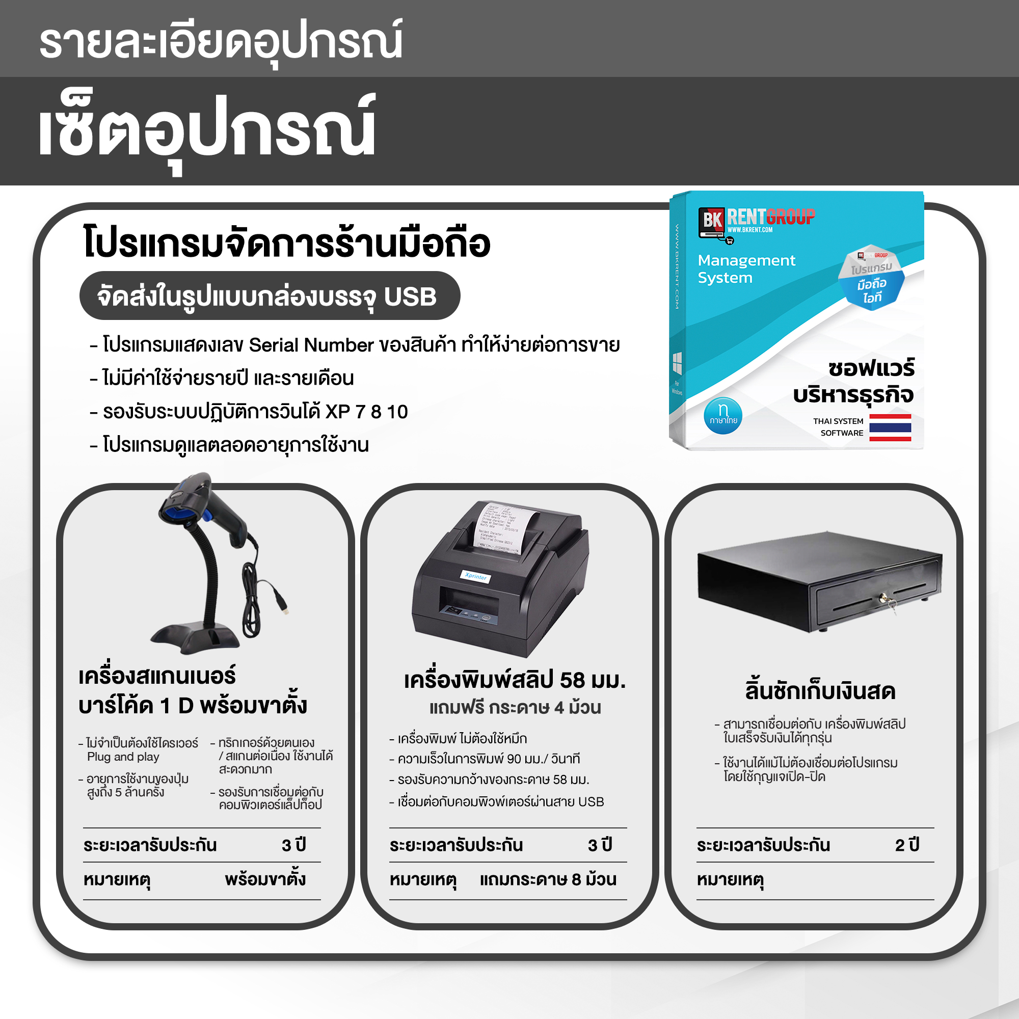 5. ตัวโปรแกรมซอฟต์แวร์ โปรแกรมร้านมือถือและอุปกรณ์ไอที จัดส่งในรูปแบบกล่องบรรจุ USB (รองรับระบบปฏิบัติการ Windows) โปรแกรมดูแลตลอดอายุการใช้งาน